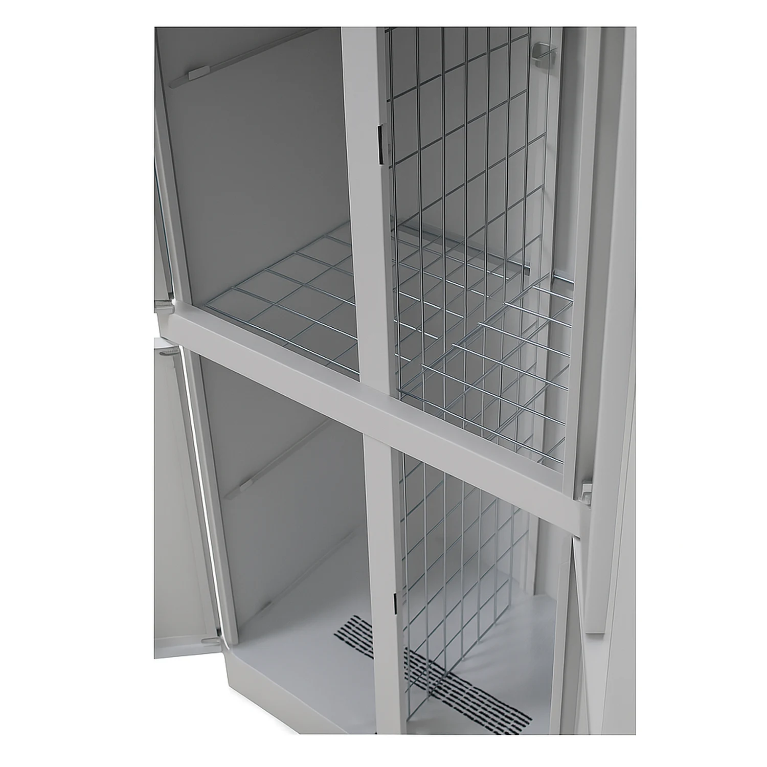 Каждое отделение закрывается отдельной дверцей с замком, а внутри установлена съёмная сетчатая полка, которую можно переставлять по высоте.